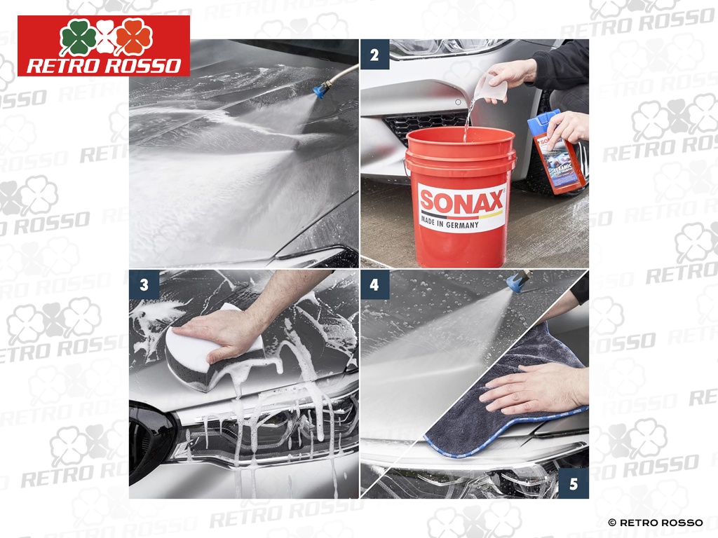 Rincer les salissures grossières avec un jet deau puissant. Agiter le flacon avant utilisation. Diluer 50 ml de produit dans 10 litres deau chaude et faire mousser. Laver le véhicule de haut en bas avec léponge multifonction SONAX. Ne pas laisser sécher le shampooing traiter si nécessaire par sections. Rincer abondamment à leau claire puis sécher, par exemple avec la chiffon microfibre SONAX spécial séchage Plus.